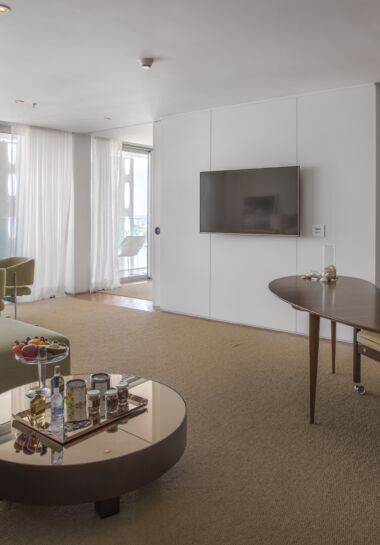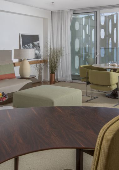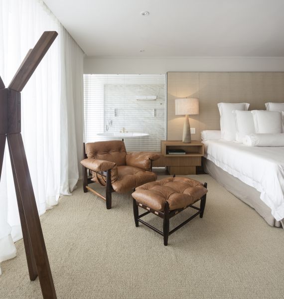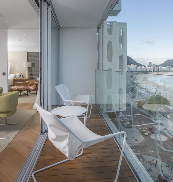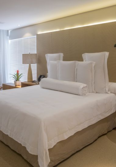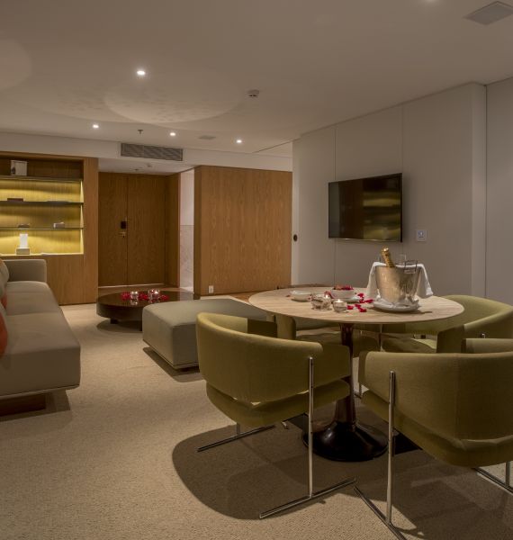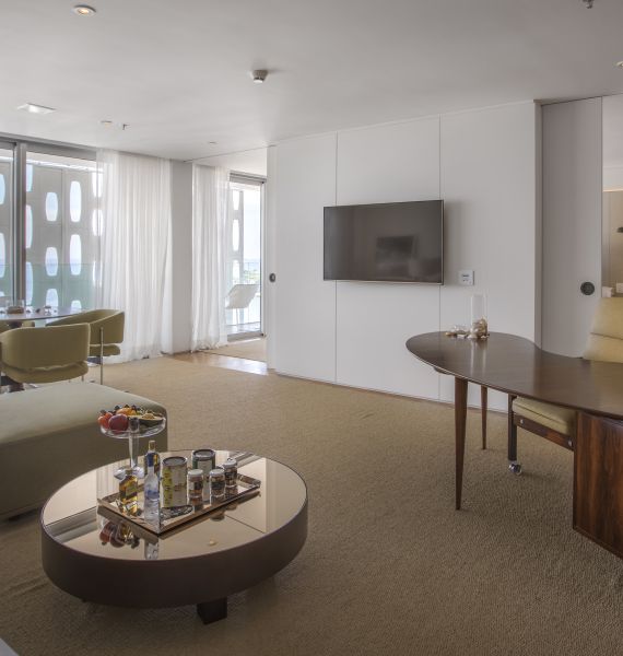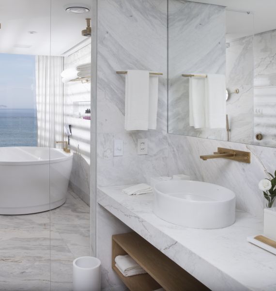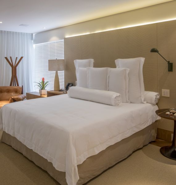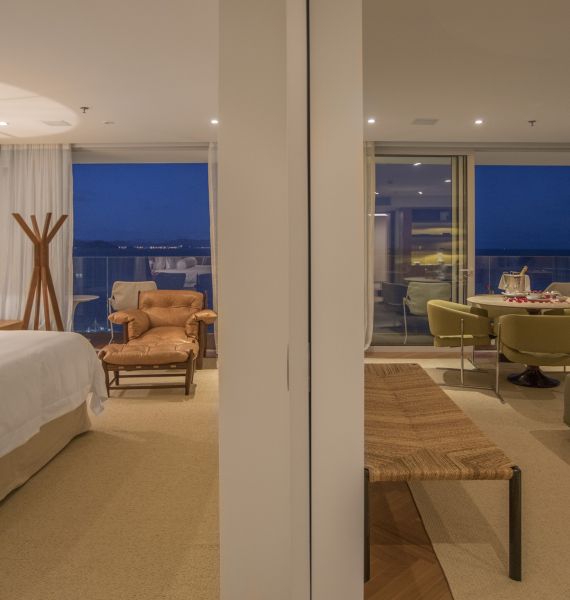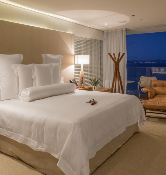 - Suíte localizada no 10º andar, com 120m², cama super king size e vista mar