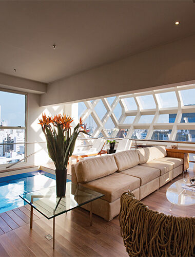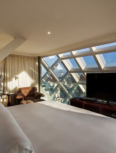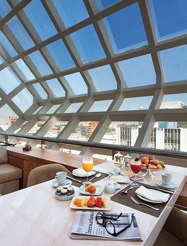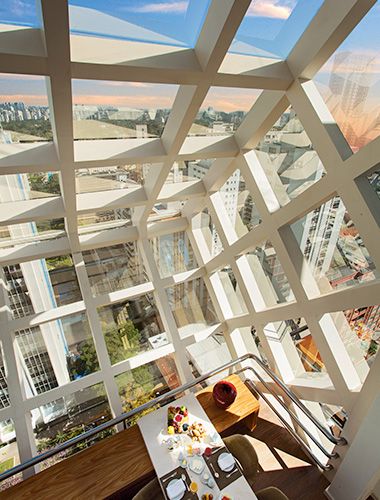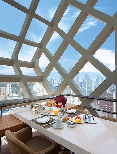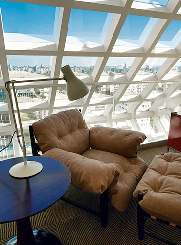 Located on the penthouse of the hotel, a glass cube allows for a 180° city view.