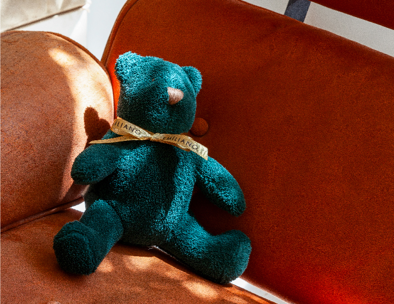 Emiliano Bear is a story of transformation and environmental awareness. Created through the Hotel Emiliano’s upcycling initiative, and with the vision of designer Luly Vianna, each bear is made from recycled towels. Hand-dyed by the NGO Orientavida, these bears support the empowerment of socially vulnerable women.